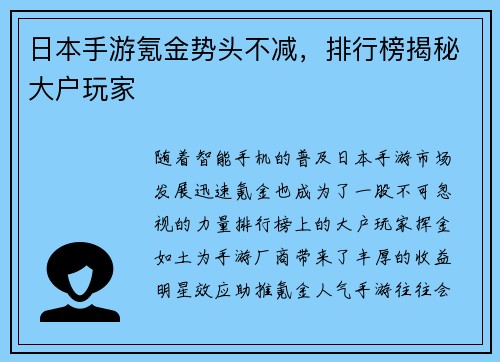 日本手游氪金势头不减,排行榜揭秘大户玩家